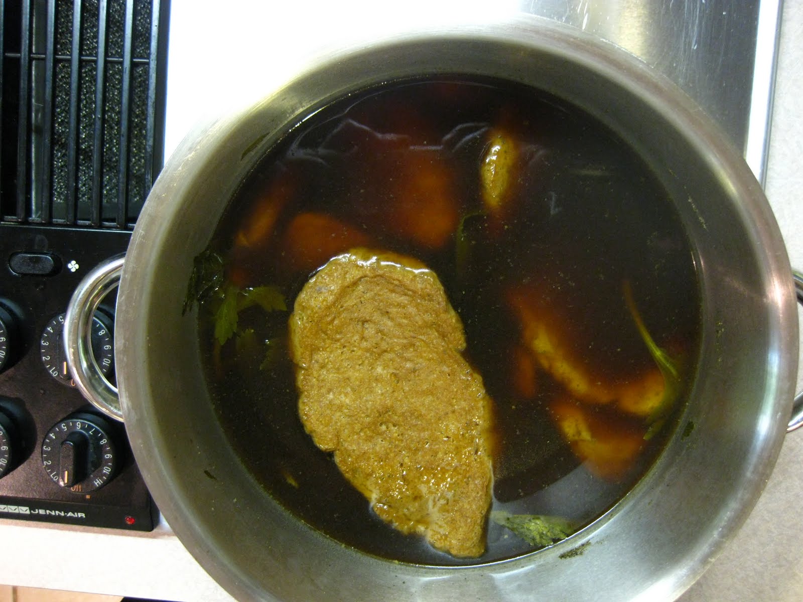 Here's the cooking broth. I started with very cold broth (by adding a few ice cubes) when the steaks were submerged. I used a very low setting on my element (2) to be sure the temperature was raised very slowly. The only problem is that eventually it will boil furiously, something you really don't want unless you like Goodyear-style seitan. It's best to use a very minimal simmer. So you have to watch the pot during this process.