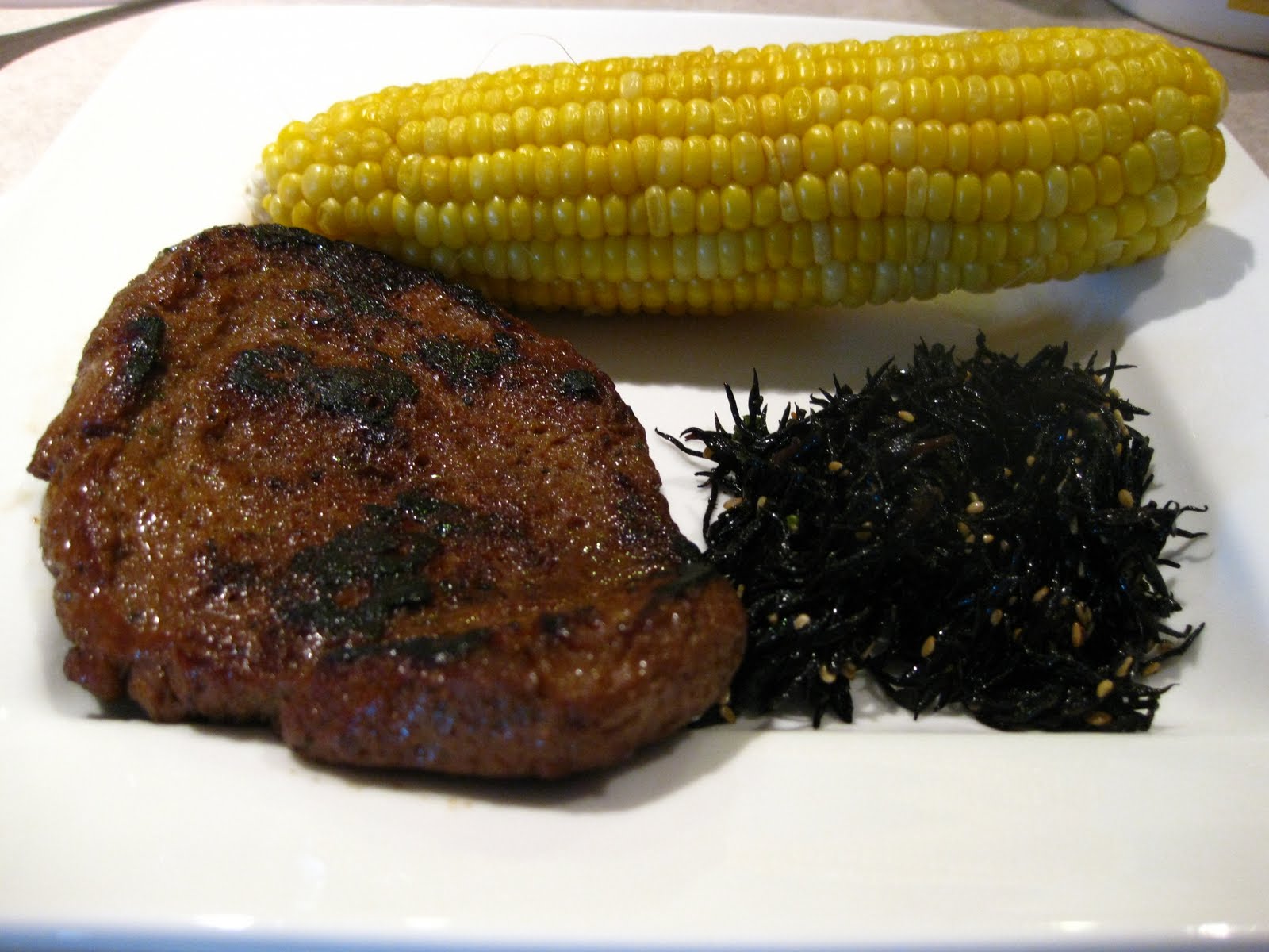 | East meets Midwest. Seitan bulgogi, stir-fried hijiki and steamed corn. |